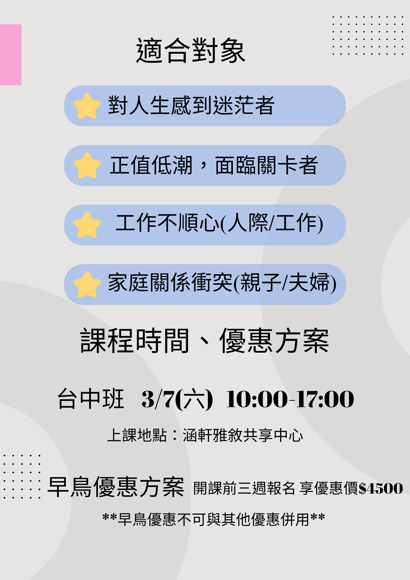 > 因每場課程活動皆需準備材料,最遲須於開課22日前通知取消或延期