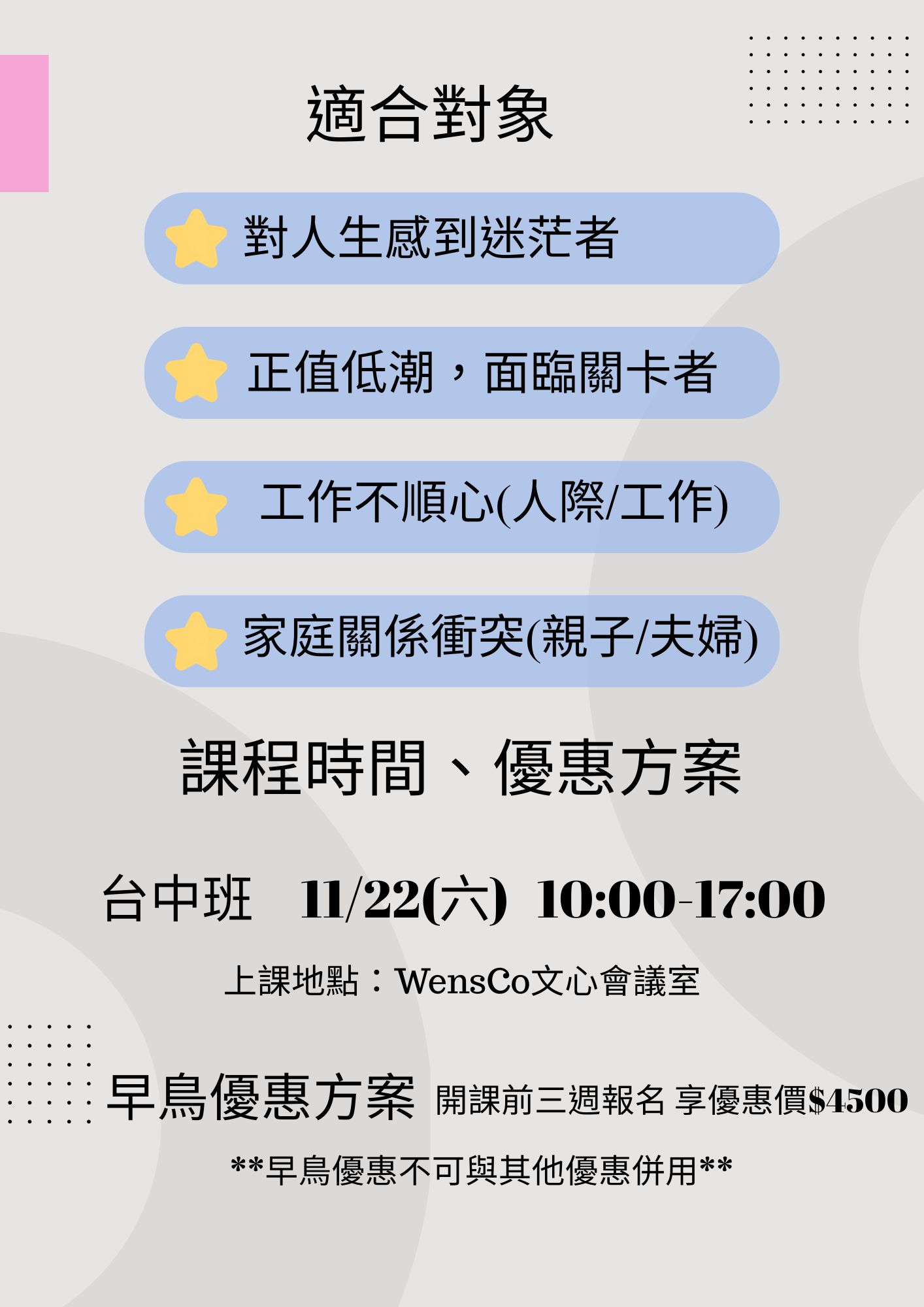 > 因每場課程活動皆需準備材料,最遲須於開課22日前通知取消或延期